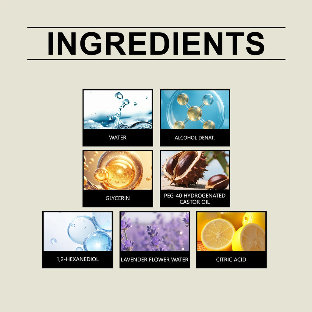 ●INGREDIENTS:AQUA、ALCOHOL DENAT.、GLYCERIN、PEG-40 HYDROGENATED CASTOR OIL、1,2-HEXANEDIOL、LAVENDER FLOWER WATER、 CITRIC ACID